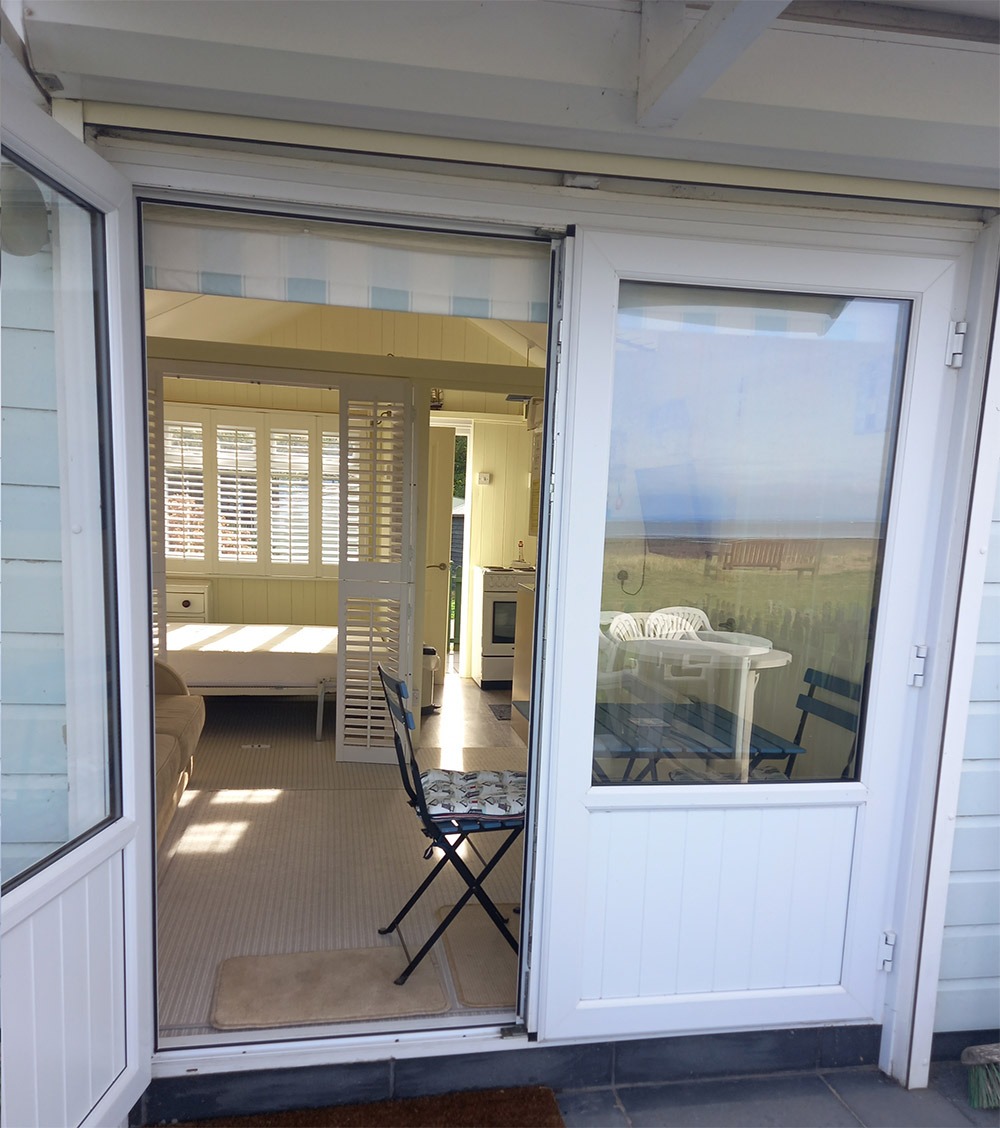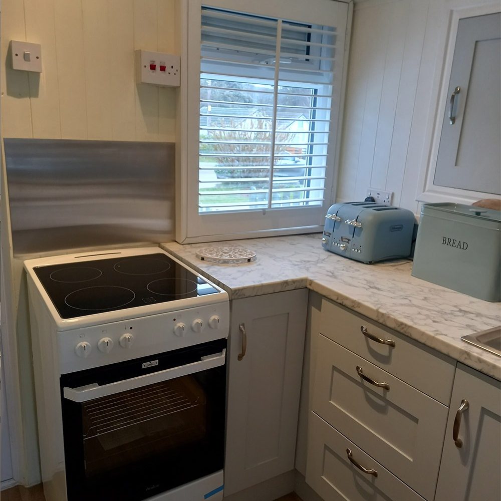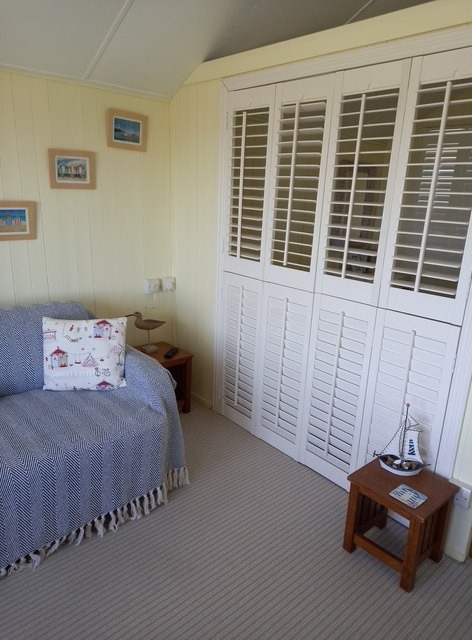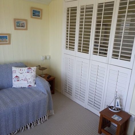The separate bedroom has a double bed with comfy memory foam mattress. Plantation shutters form the wall between the living area and the bedroom giving complete privacy. When left open they allow for a light and airy open plan feel.