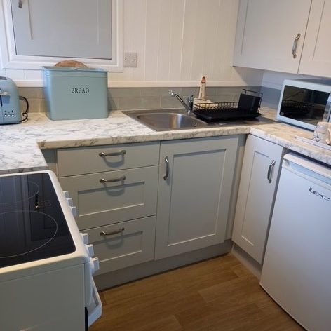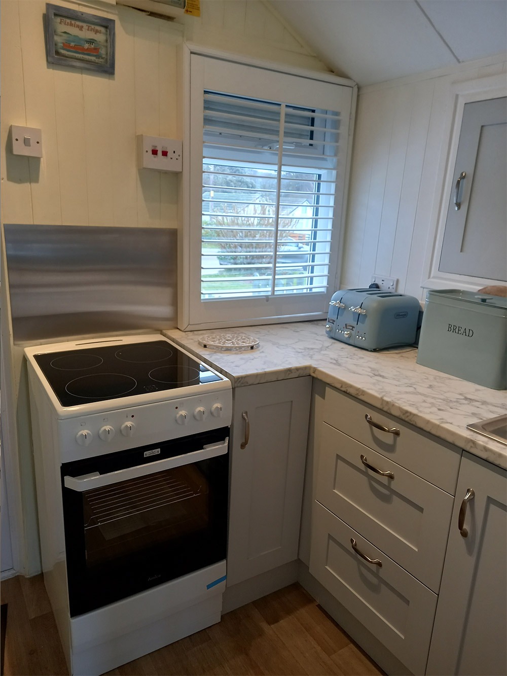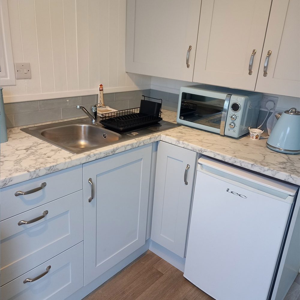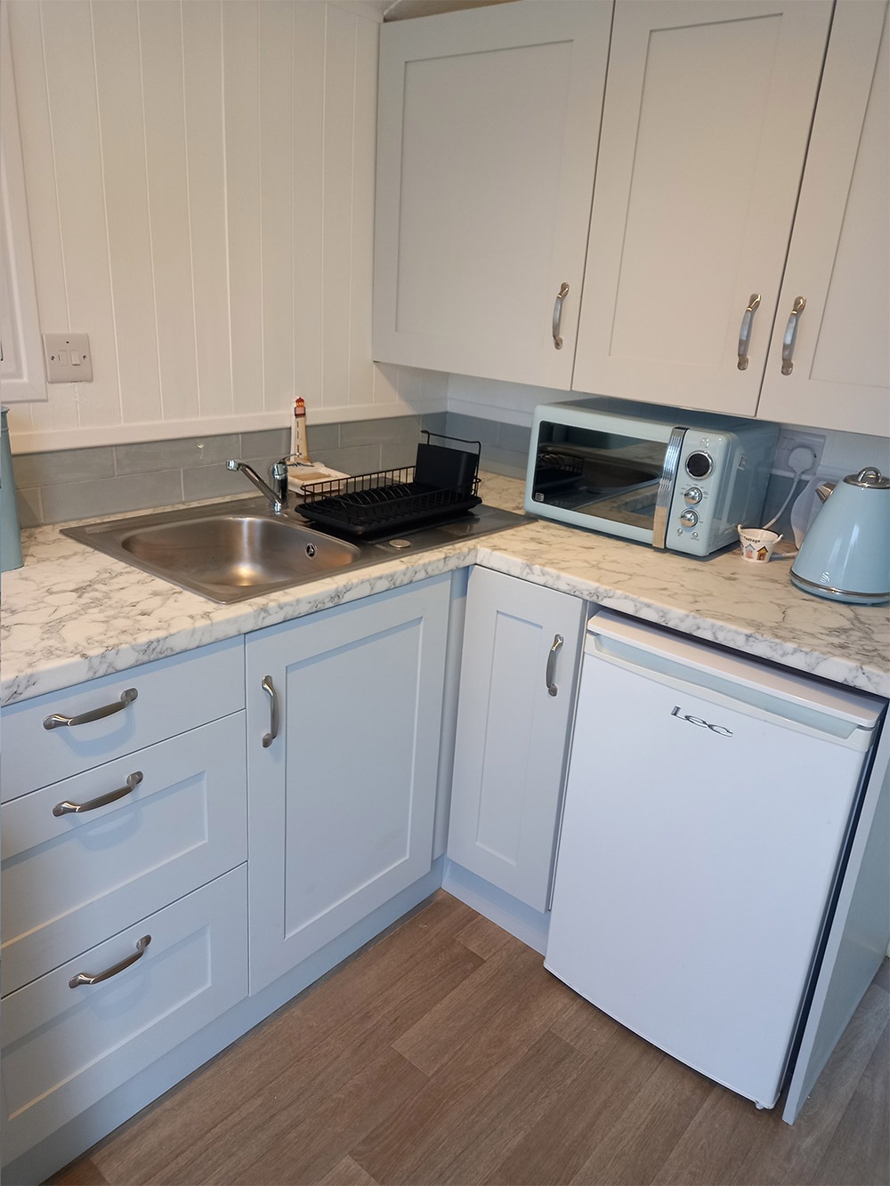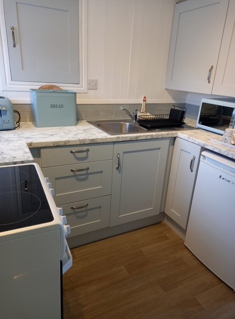 The kitchen area is fully equipped with cooker, fridge, microwave, kettle, and toaster.