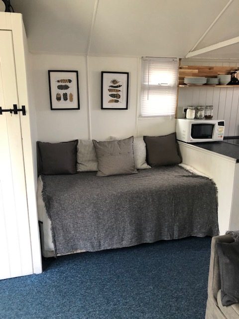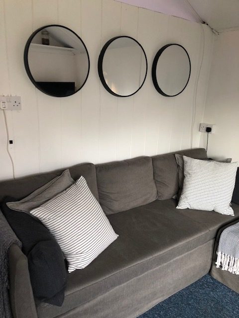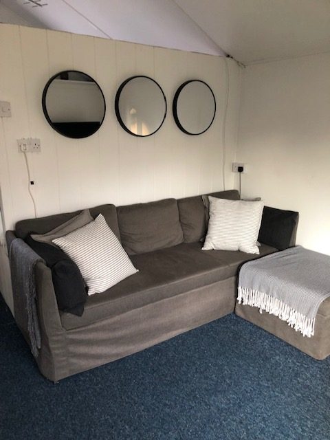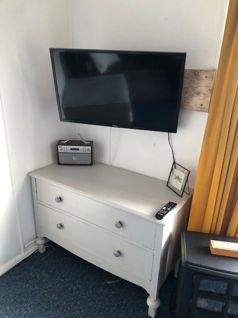 The lounge/dining room has a small single bed and a large king-size sofa bed. A folding dining table and chairs. Wall mounted TV and radio.