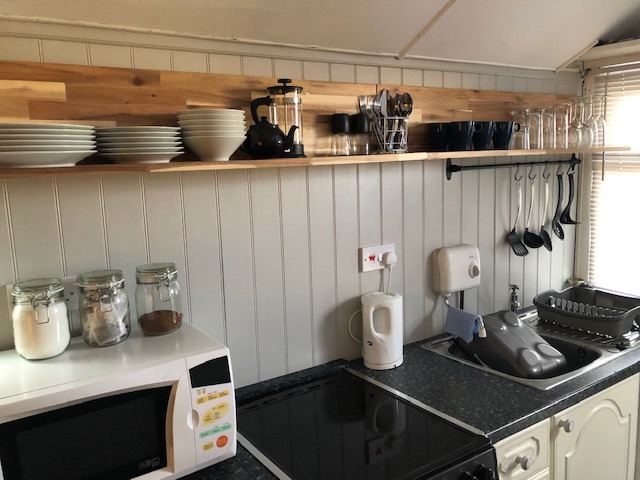 The kitchen is fitted with oven, hob, fridge with small freezer section, Toaster, kettle, and Microwave. Tea towels, and complimentary tea, coffee and sugar are included