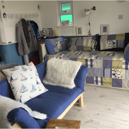 There is a day bed that pulls out to form a king size bed, a Futon Company 2 seater sofa the ends of which fold down to make a single bed it therefore sleeps 3.