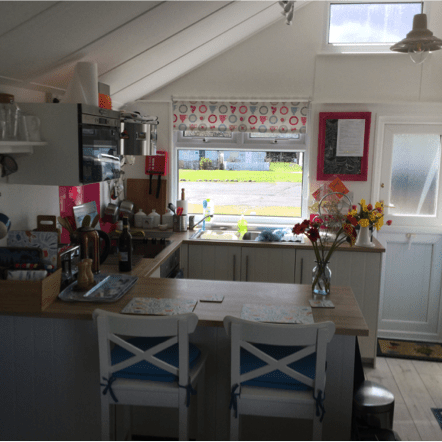 A breakfast bar with 2 bar stools, a gate leg table and four folding chairs, place settings, cutlery etc for up to 4 people complete the facilities.