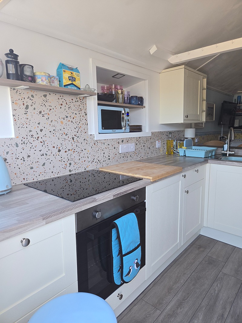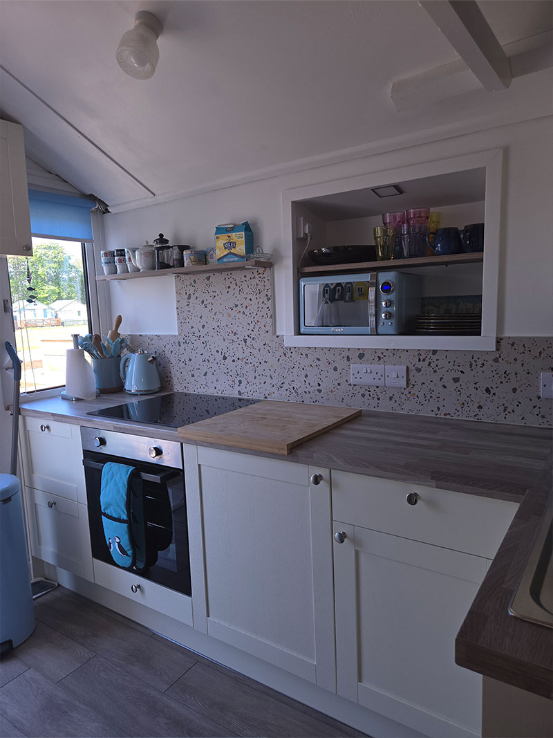 The chalet is equipped with a newly fitted kitchen with integrated electric oven, fridge with small freezer compartment, microwave, wall mounted flat screen TV/DVD/CD player, a hairdryer and a W.C. with wash basin only, no shower.