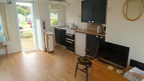 Chalet 71 enjoys wonderful views of the surrounding countryside and over the Bristol Channel. The chalet is open plan and the kitchen area and bathroom have recently been renovated. There is a fold-out table with chairs for dining inside and seating atthe front and back of the chalet for eating al fresco. There is a comfortable fold-out sofa bed and plenty of storage for clothing and other luggage. All electricity is included in the price. Please bring your own duvet, pillows, linen and towels.