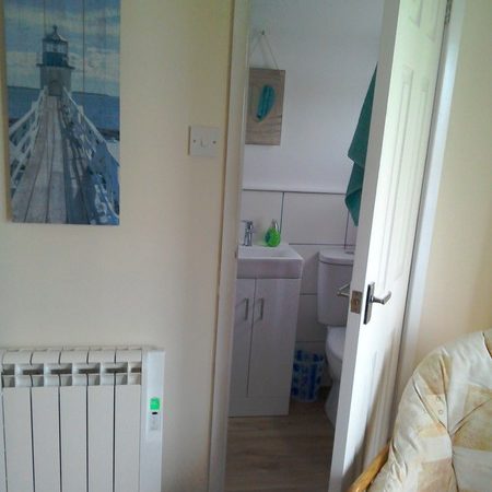 There is a flush toilet, shower and hand washbasin off the lounge.