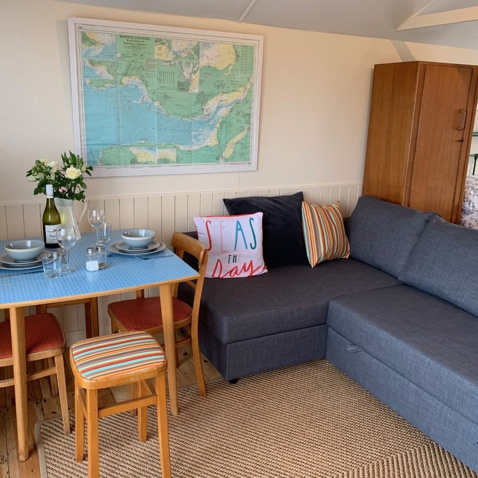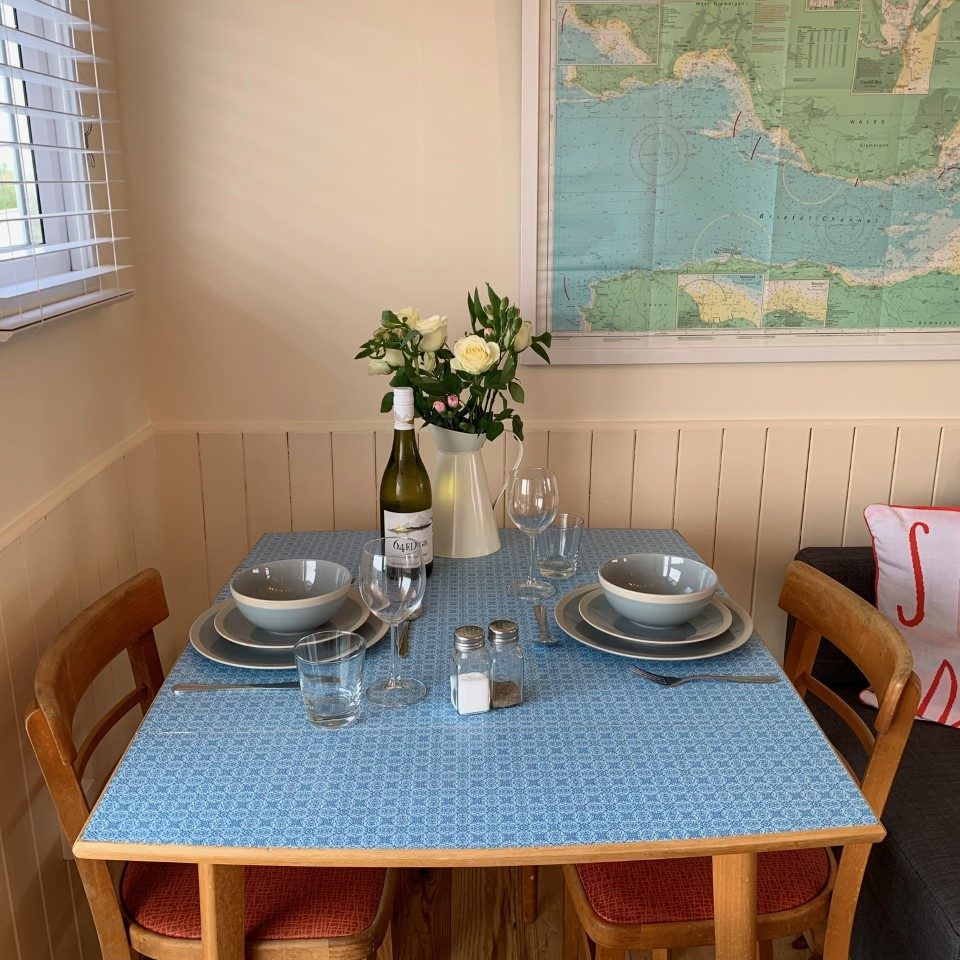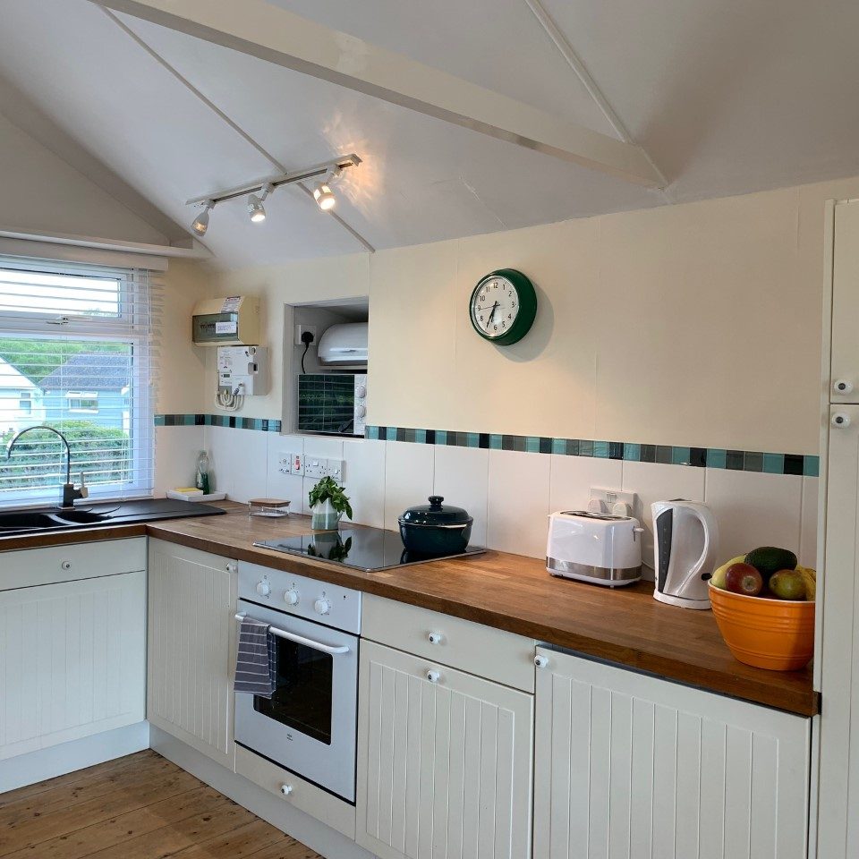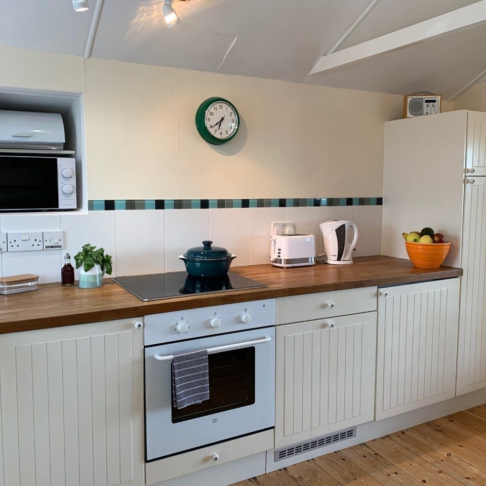 The kitchen area has a solid wooden worktop, fridge, cooker, microwave, kettle, and toaster, crockery, and glasses for 4, along with all cooking utensils. There is a ‘retro’ extending dining table and four chairs/stools for easy dining.