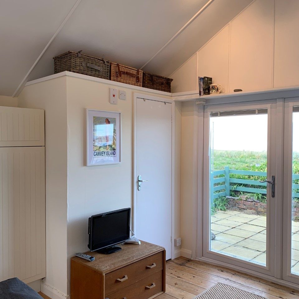 Large, double-glazed doors to the rear open onto a paved, fenced patio area giving expansive views across to Wales. There is a 4-seater picnic table where you can sit and enjoy the morning sun. The front fenced patio has 2 chairs for enjoying a glass of wine in the evening as you watch the sun go down.
