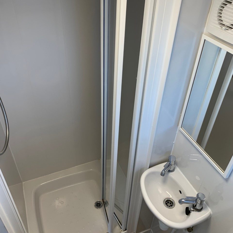 A compact, efficient shower room with toilet and washbasin completes the layout.