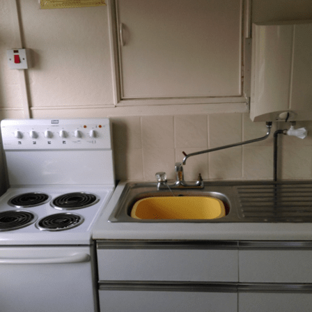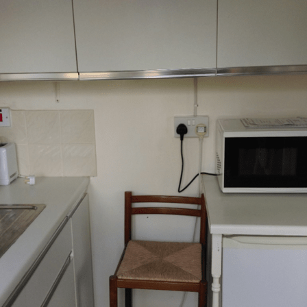 A fully equipped kitchen with fridge, cooker, microwave & toaster.