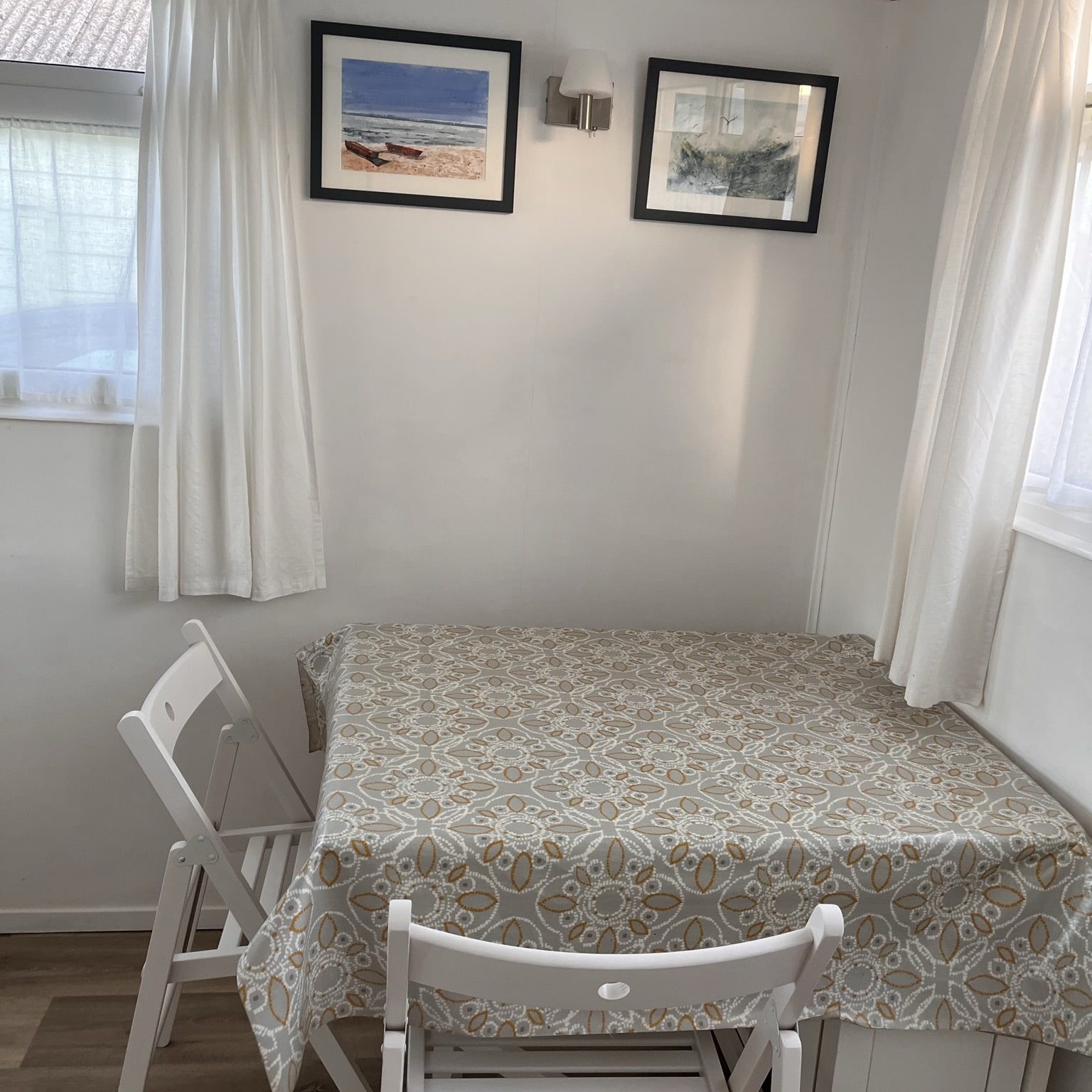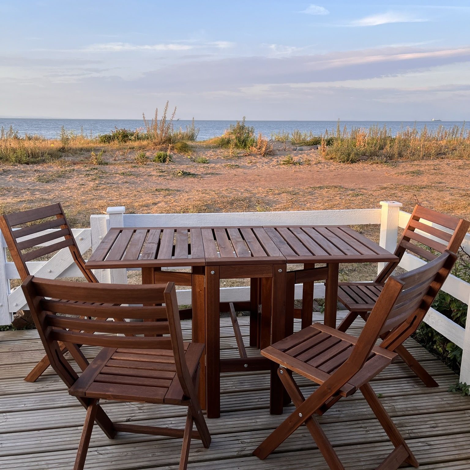 Four wooden chairs/table on the rear decking for al fresco dining and sea gazing.