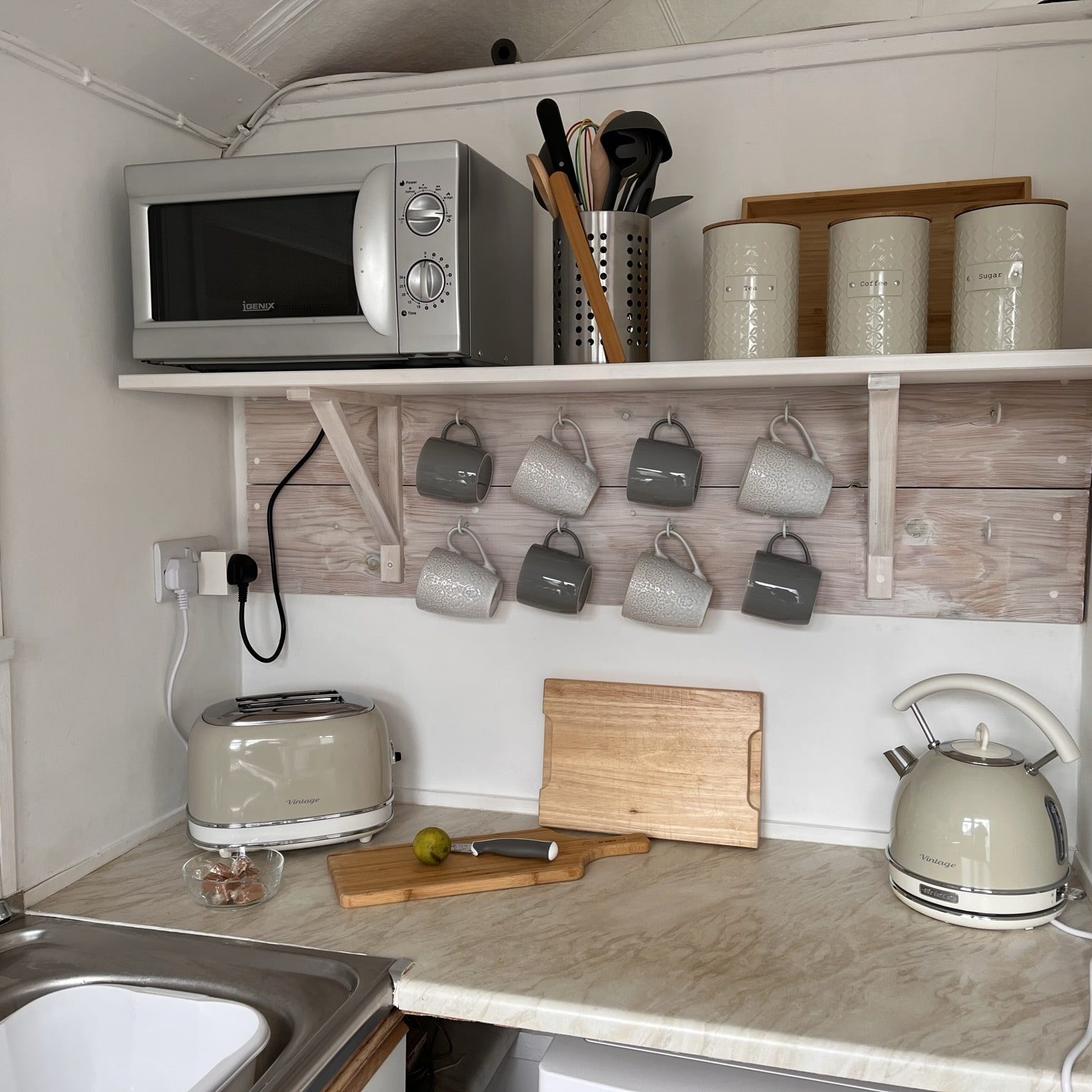 Kitchen equipped with kettle, toaster, microwave, cooker, fridge with small freezer and electric water heater. The cooker has four rings, a grill and oven.