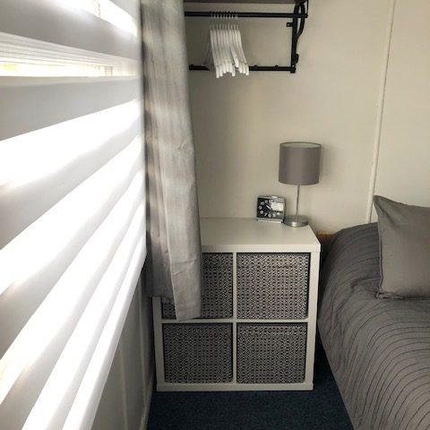 It has a separate bedroom with a double bed, Hanging space and storage units in a bedside chest. There is a hairdryer, Iron and underbed storage.