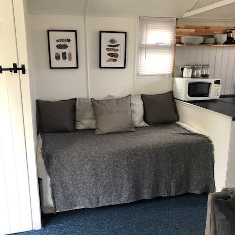 The lounge/dining room has a small single bed and a large king-size sofa bed. A folding dining table and chairs. Wall mounted TV and radio.