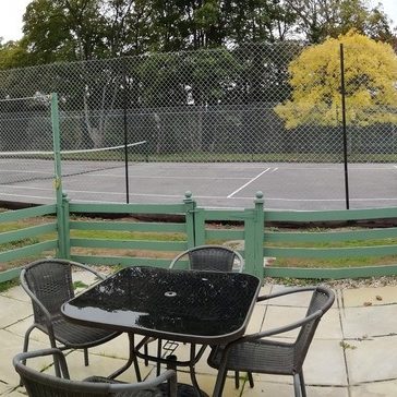 • 4 chairs + table at the back, south facing overlooking the tennis court towards the lake.