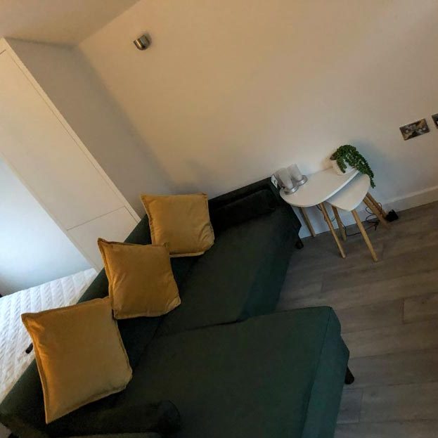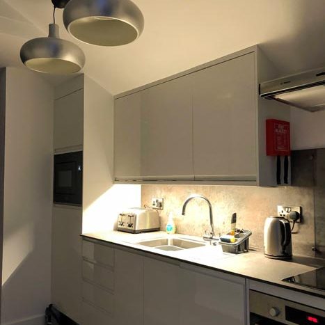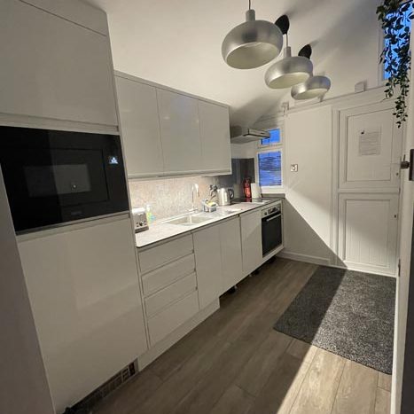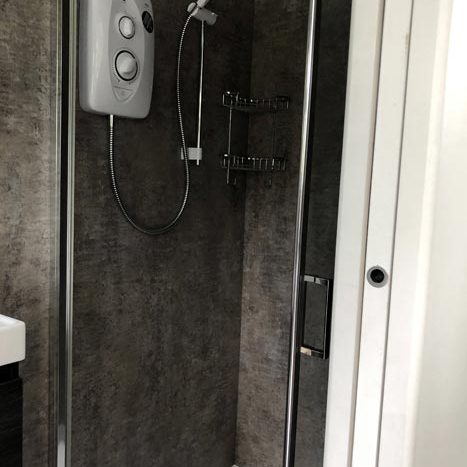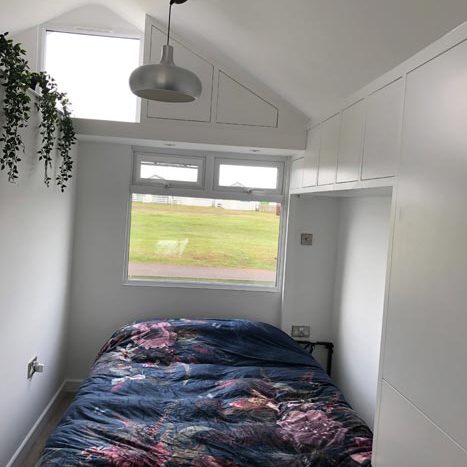 King size pull down bed with full sprung mattress which allows for extra day time space when not in use, the area is segregated from the galley kitchen by a wall. Kitchen consists of integrated fridge/freezer, dishwasher, microwave and cooker. There is a kettle & toaster and all the usual dining items required for a holiday.