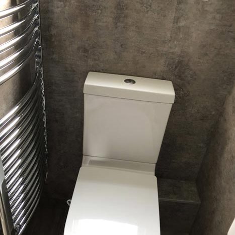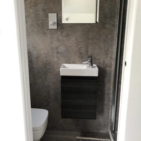 A sliding door leads to an electric shower, toilet, heated towel rail & wash hand basin