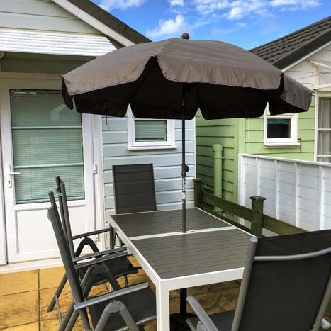Patio area has a set of 4 chairs and a table with 2 sun reclining loungers and an umbrella in a storage unit for all to enjoy.