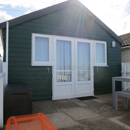 One bedroom with a bi-fold door features an L-shaped triple bunk bed, with the shower room and toilet opposite. The main open-plan living space has a double sofabed and comprises a well-stocked kitchen area. Back doors take in the full benefit of the lovely sea views and lead onto the rear patio and beach.