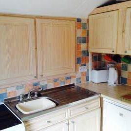 - Kitchen with full size cooker, fridge with ice box and microwave